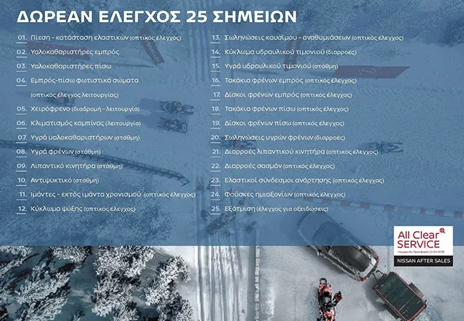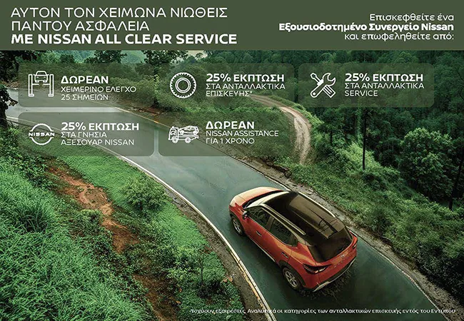 H πραγματοποίηση τεχνικού ελέγχου και συντήρησης στο δίκτυο των εξουσιοδοτημένων επισκευαστών της Nissan είναι απαραίτητη, προκειμένου να κινηθείτε με ασφάλεια αλλά και με μεγαλύτερη οικονομία καυσίμου κατά την χειμερινή περίοδο. Για αυτό φροντίζει το άρτια εκπαιδευμένο τεχνικό προσωπικό της Nissan, με κορυφαία διαγνωστική τεχνολογία και γνήσια ανταλλακτικά που εγγυώνται το καλύτερο δυνατό αποτέλεσμα για τη συντήρηση και επισκευή του αυτοκινήτου σας.